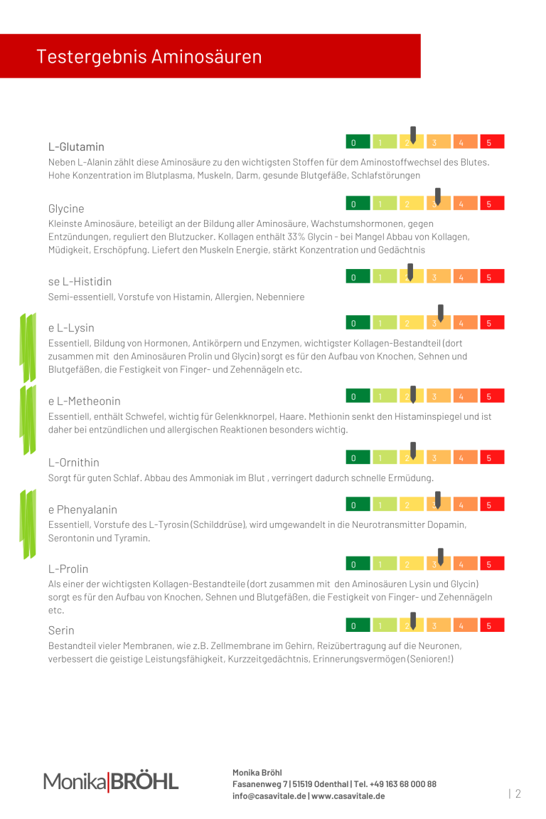 Frau Bröhl-Croci hatte die Analyse durchgeführt und wir konnten hier ganz deutlich sehen, wo meine Defizite sind und man konnte meine Beschwerden auch ganz deutlich den Bereichen zuordnen die im Keller waren, hauptsächlich im Bereich Aminosäuren.